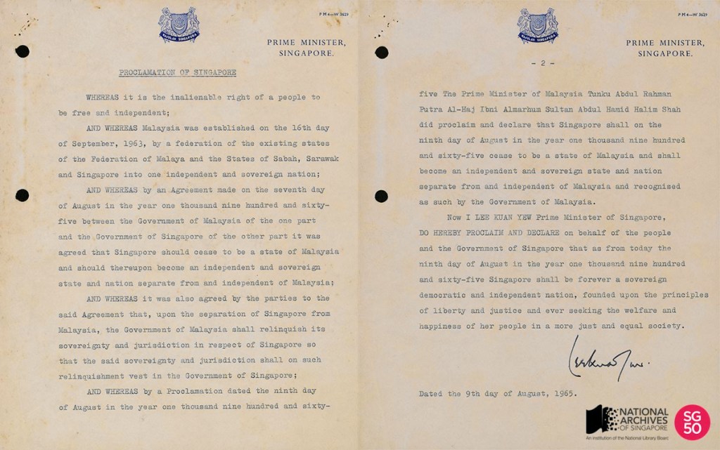 Today is Singapore’s 59th birthday. Many people don’t realise that Singapore is perhaps the only country in modern day history to be forced to be independent. I’m always fascinated by the story behind Singapore’s independence. The last few days leading to Singapore being expelled from Malaysia. One thing that I find interesting is the Proclamation of Singapore document.