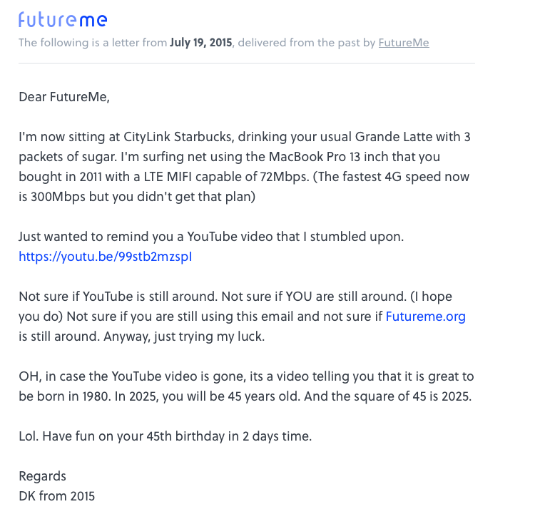 Two days ago, I received an email from myself back in 2015, sent via FutureMe.